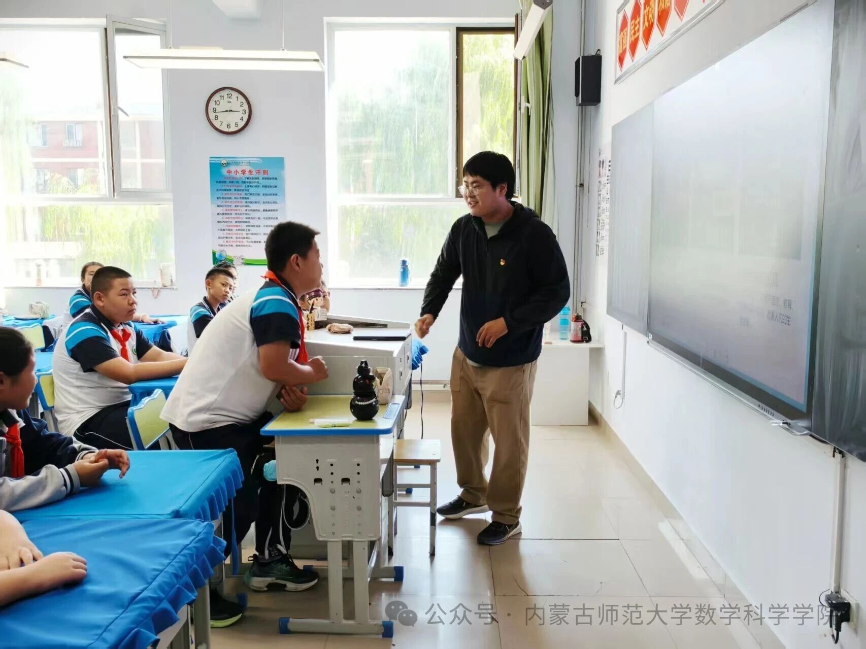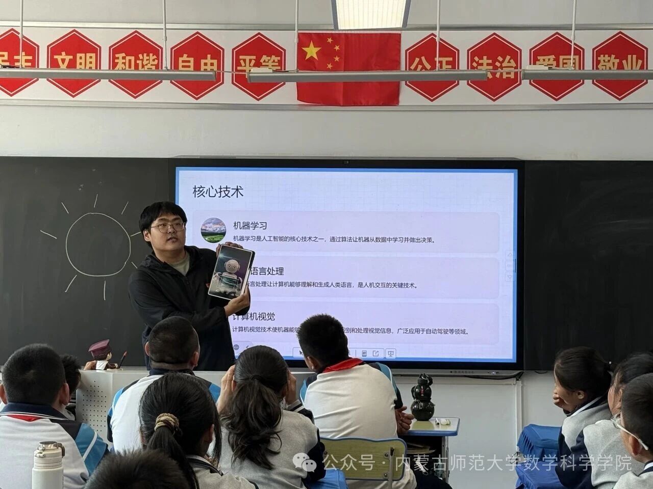 在和林格尔县乳业开发区第一小学,内蒙古科学技术普及学会兼职副秘书长、内蒙古师范大学数学科学学院博士研究生乌日乐等一群研究生科普志愿者,他们用所学的“数据科学与智能信息处理”“基础数学”“应用数学”等学科专业,用通俗易懂的语言,为小学生普及“人工智能是什么”“人工智能会做什么”“机器是怎样看懂图像的”,通过活动让学生积极体验,在活动中感知科技、思考未来、收获新知。