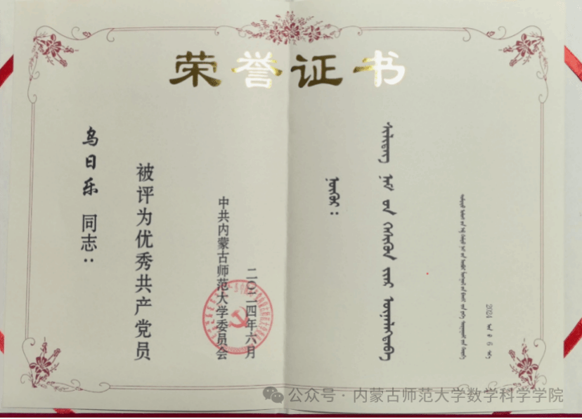 乌日乐,男,蒙古族,中共党员,内蒙古师范大学数学科学学院2024级博士研究生,专注于数学与人工智能交叉领域的研究,现任数学科学学院博士研究生党支部组织委员。在校期间,他始终以“德才兼备、全面发展”为准则,在思想淬炼、学术科研、竞赛实践、志愿服务等方面表现突出,充分展现了新时代青年党员与研究生的责任担当和昂扬向上的精神风貌。2025年10月荣获全区高校党建“双创”研究生党员标兵荣誉称号。