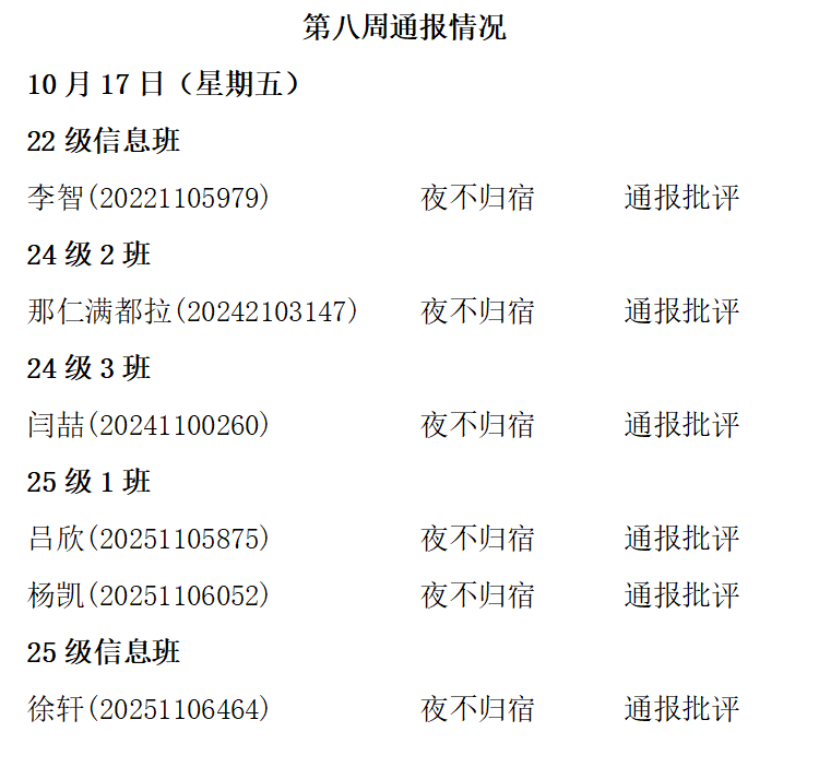 数学科学学院2025——2026年度第一学期第八周通报情况