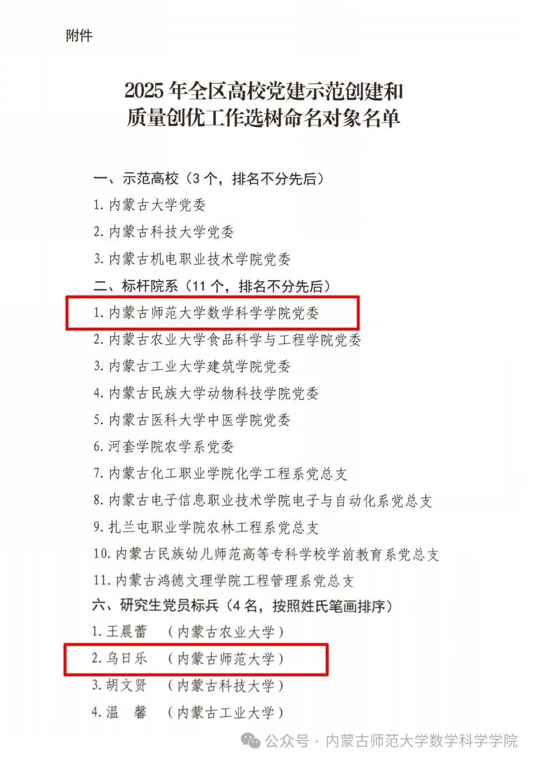 近日,自治区党委教育工委公布了2025年全区高校党建示范创建和质量创优工作拟选树命名对象,内蒙古师范大学数学科学学院党委成功入选“全区高校党建标杆院系”,我院博士研究生乌日乐荣获“研究生党员标兵”荣誉称号。