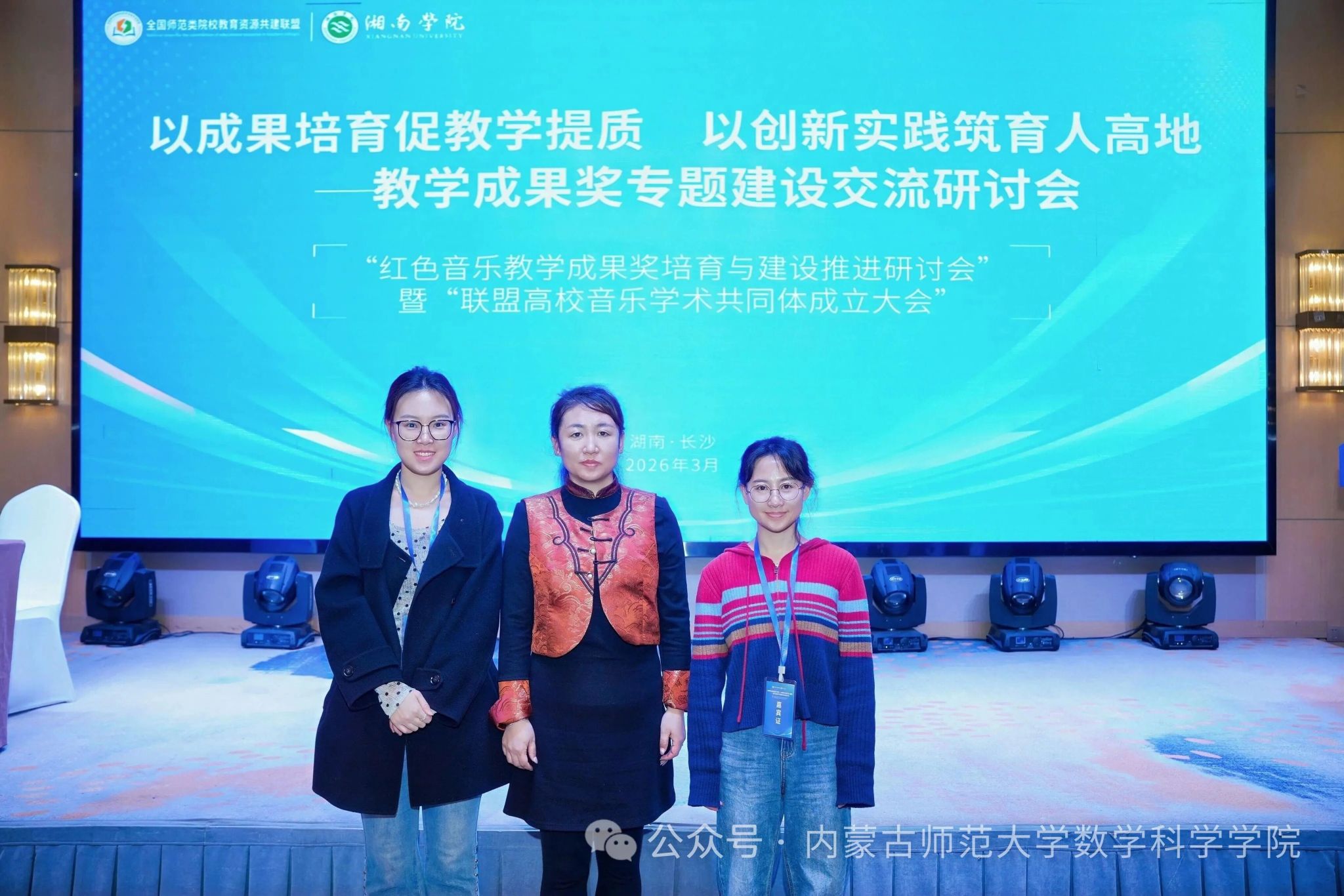 进一步深化教育教学改革,精准把握2026年各级教学成果奖评选趋势,提升教学成果培育与申报质量,3月13日至16日,内蒙古师范大学数学科学学院数学系主任乌日柴胡、副系主任郑佳璇、信息与计算科学系副系主任周艳娇三人赴湖南长沙参加“以成果培育促教学提质,以创新实践筑育人高地——教学成果奖专题建设交流研讨会”。本次会议由全国师范类院校教育资源共建联盟主办,湘南学院承办,汇聚了来自全国多所高校的校级领导、二级学院院长及教学团队骨干。