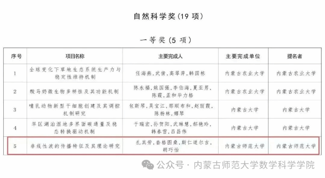 近日,内蒙古师范大学数学科学学院院长扎其劳教授带领团队完成的“非线性波的传播特征及其理论研究”项目,荣获自治区自然科学奖一等奖。这一荣誉不仅是对团队学术创新能力的肯定,更是我院数学学科发展的重要里程碑。