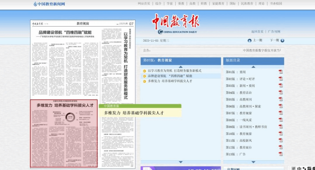 《中国教育报》2025年11月5日第07版教育视窗,以”多维发力 培养基础学科拔尖人才“为题报道内蒙古师范大学数学科学学院基础学科拔尖人才培养工作成效。全文链接:http://paper.jyb.cn/zgjyb/h5/html5/2025-11/05/node_1.htm?v=1&curr=6