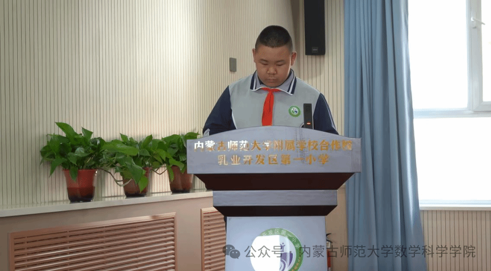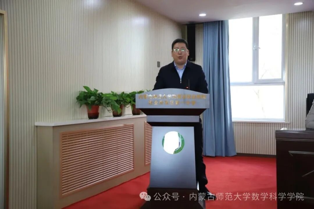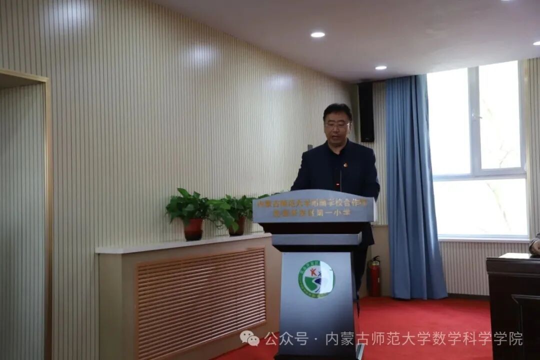 乳业开发区第一小学常务副校长庞海文致欢迎辞,对内蒙古师范大学数学科学学院的支持表示感谢,期待以实践基地为纽带,丰富校园育人活动,助力学生全面成长。