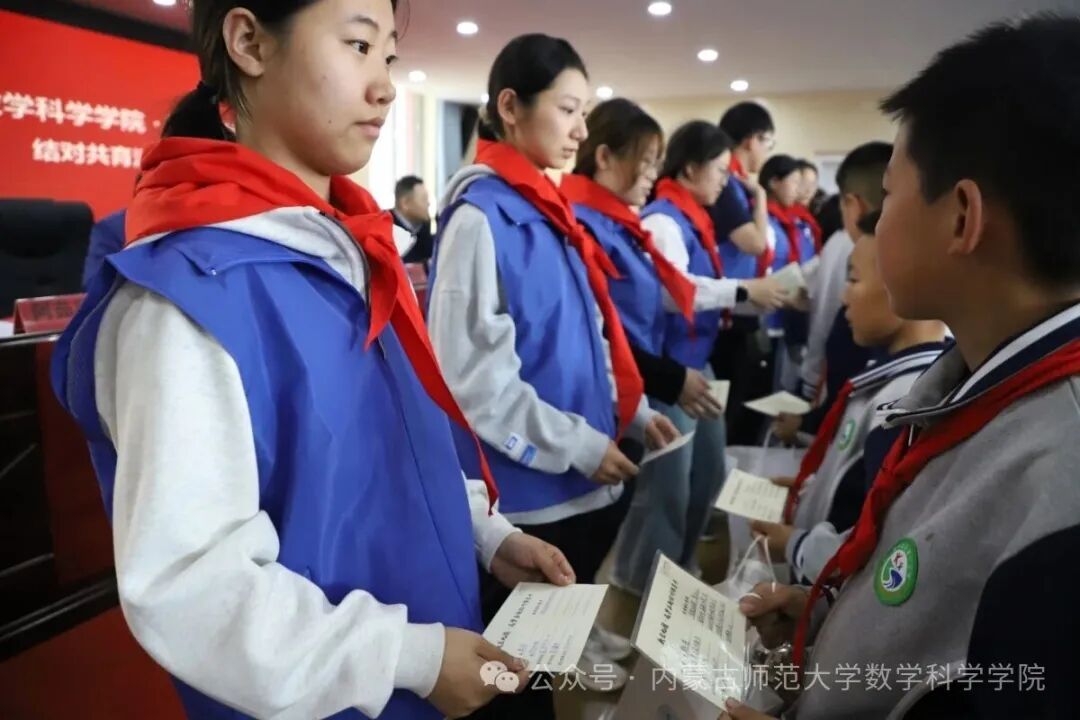 仪式现场,小学生代表为结对大学生志愿者佩戴红领巾,大学生志愿者为孩子们赠送礼物,双方交换筑梦启航信息卡,正式结成帮扶对子,传递温暖与希望。