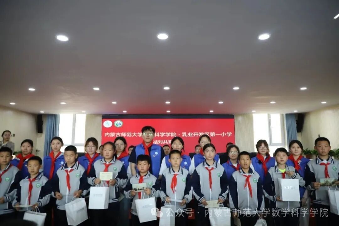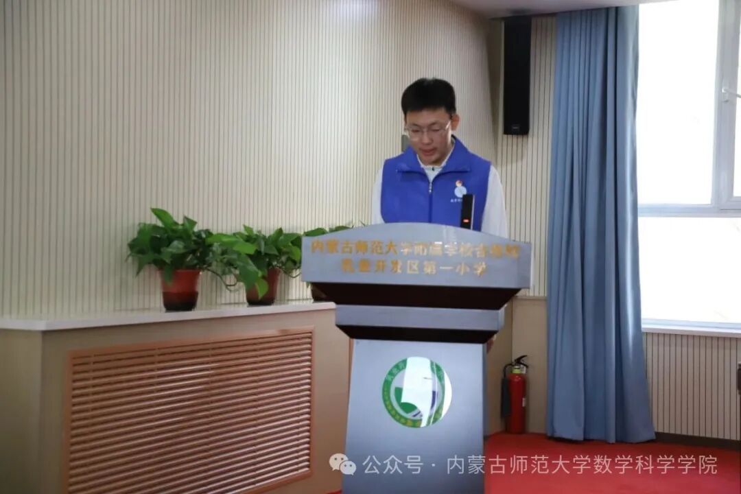 和林格尔县教育局局长王志宏、副局长赵欣;学院党委书记张伟、党委副书记、副院长季建光、教授毕力格图;内蒙古师范大学附属学校副校长、乳业开发区第一小学书记、校长贾杰民、常务副校长庞海文、学校教师代表、学生代表及志愿者代表共同参与本次仪式。仪式由数学科学学院团总支副书记阿茹罕主持。