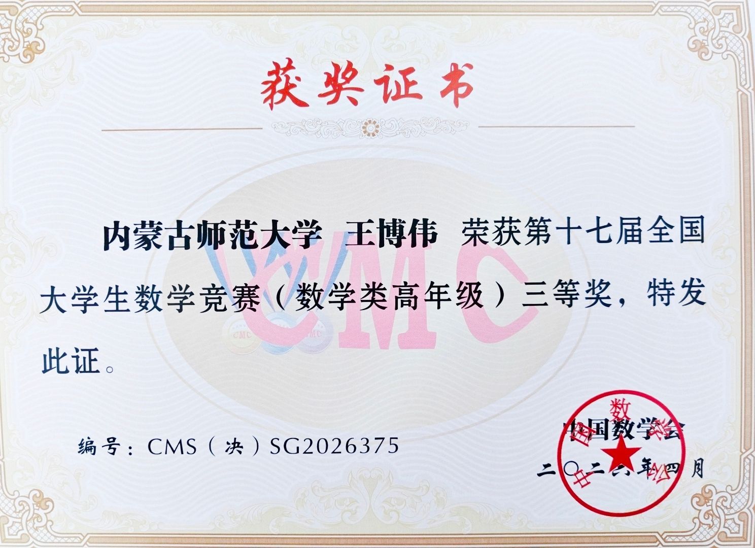 全国大学生数学竞赛是由中国数学会主办、国内高校轮流承办的高水平学科竞赛,是目前国内覆盖面最广、影响力最大的大学生数学赛事之一,赛事竞争异常激烈,含金量极高。本届竞赛决赛吸引了全国众多高校的优秀学子同台竞技,王博伟同学在比赛中沉着应战,精准拆解复杂问题,高效完成答题任务,充分展现了我院学子深厚的学科素养和卓越的综合能力。